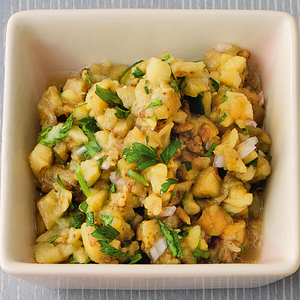 Der ideale Beitrag fürs Büffe: Ein feines Auberginen-Mus. Planen Sie etwas Vorbereitungszeit ein.