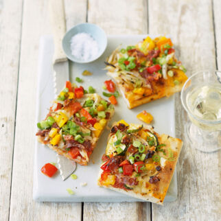Aus Mehl, Hefe, 2 EL Olivenöl, 1 TL Salz, 125 ml lauwarmem Wasser einen Teig zubereiten. Den Teig zugedeckt 30 Min. gehen lassen. Fleisch in dünne Scheiben schneiden. Knoblauch schälen, klein hacken. Rosmarin waschen und trocken tupfen, die Nadeln hacken. Beides mit Paprikapulver, Kräutern der Provence und 3 EL Öl verrühren. Das Fleisch darin 20 Min. marinieren. Tomaten und Auberginen waschen, putzen und in ca. 1 cm dicke Scheiben schneiden.