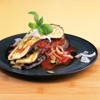 Den Auberginentopf mit etwas Tomatenmark leicht abbinden und mit Salz, Pfeffer und Honig abschmecken. Basilikumblätter bis auf 4 Stück grob schneiden und unter den Eintopf ziehen. Auf tiefe Teller verteilen und mit den Herzoginkartoffeln und dem restlichen Basilikum als Deko servieren.