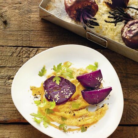 Auf Salz gegarte Rote Bete mit Kichererbsencreme