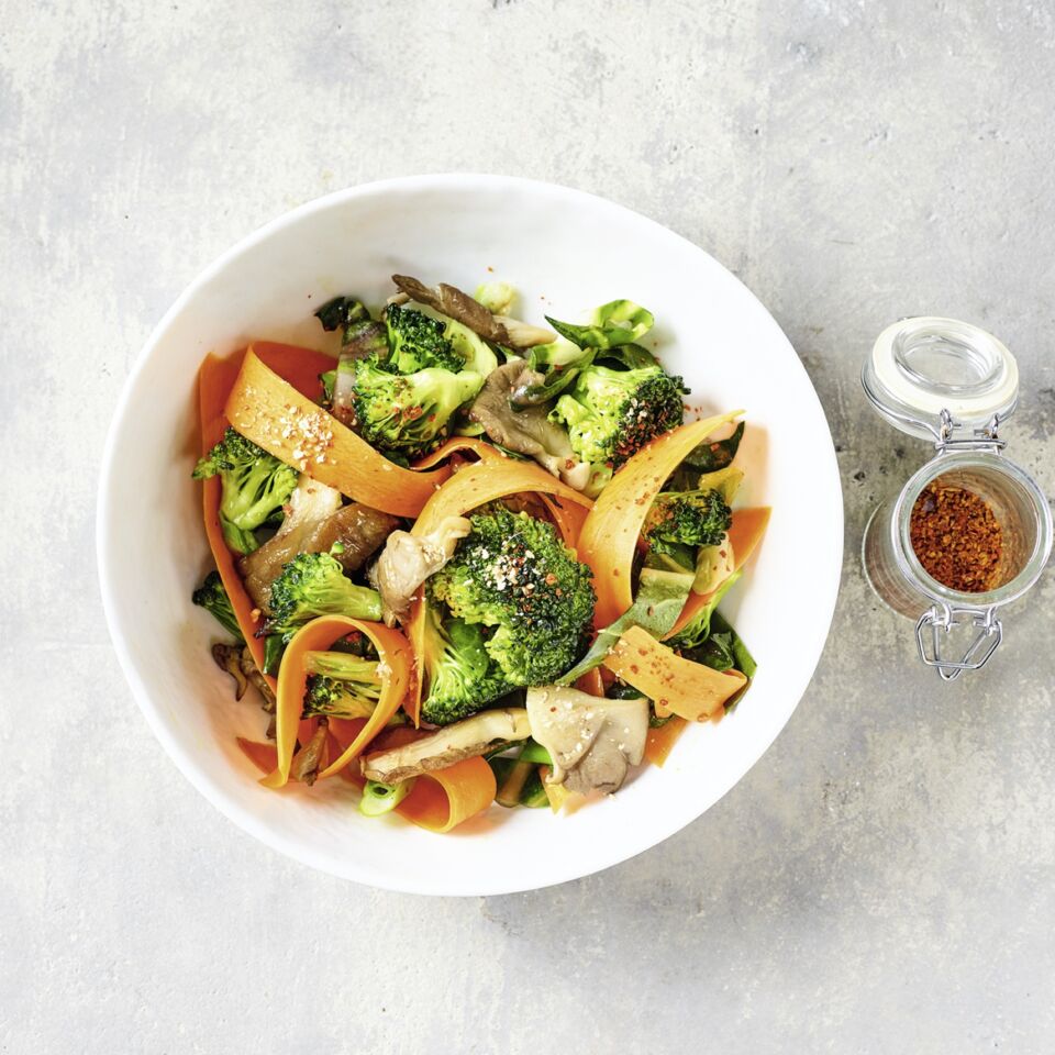 Austernpilze, Mangoldstreifen, Brokkoliröschen und Möhrenspäne dazugeben und kurz andünsten. Mit 1-2 EL Wasser ablöschen und 8-10 Min. garen.