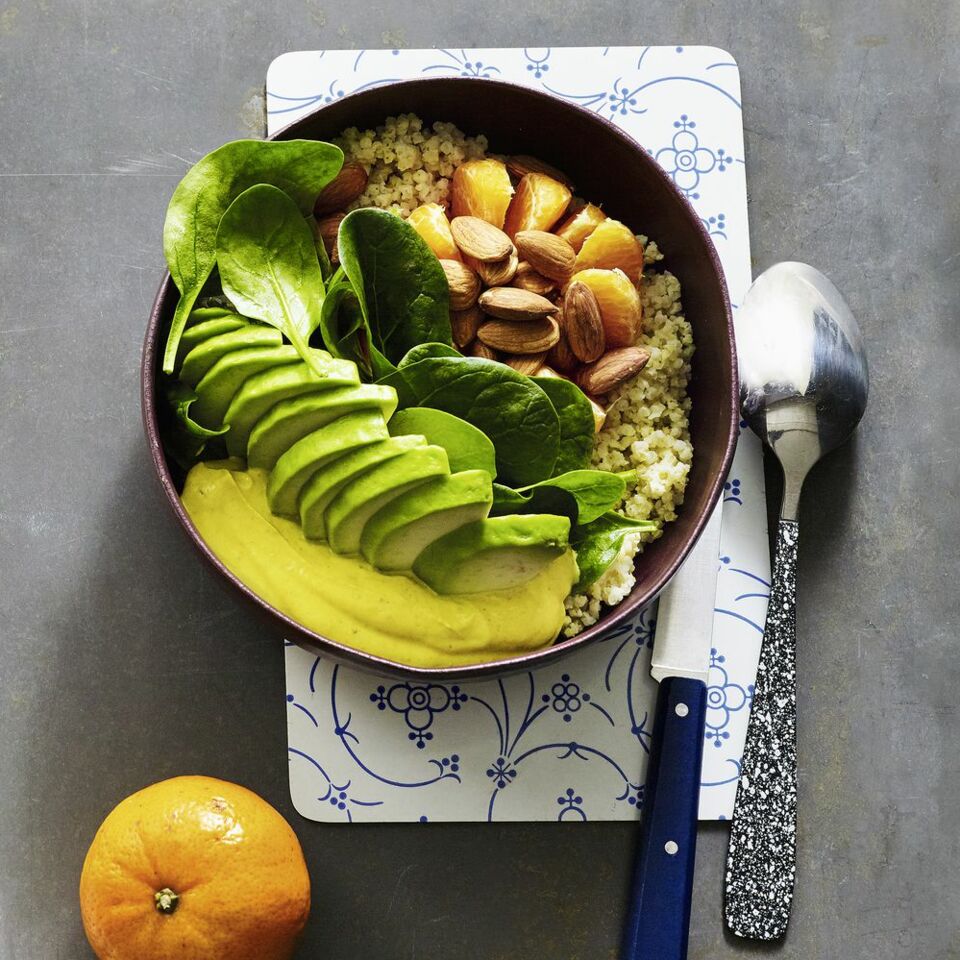 Die Hirse auflockern und in Schalen häufen. Mandarinen, Avocado, Spinat, Mandeln und den Dip darauf anrichten und die Bowls servieren.