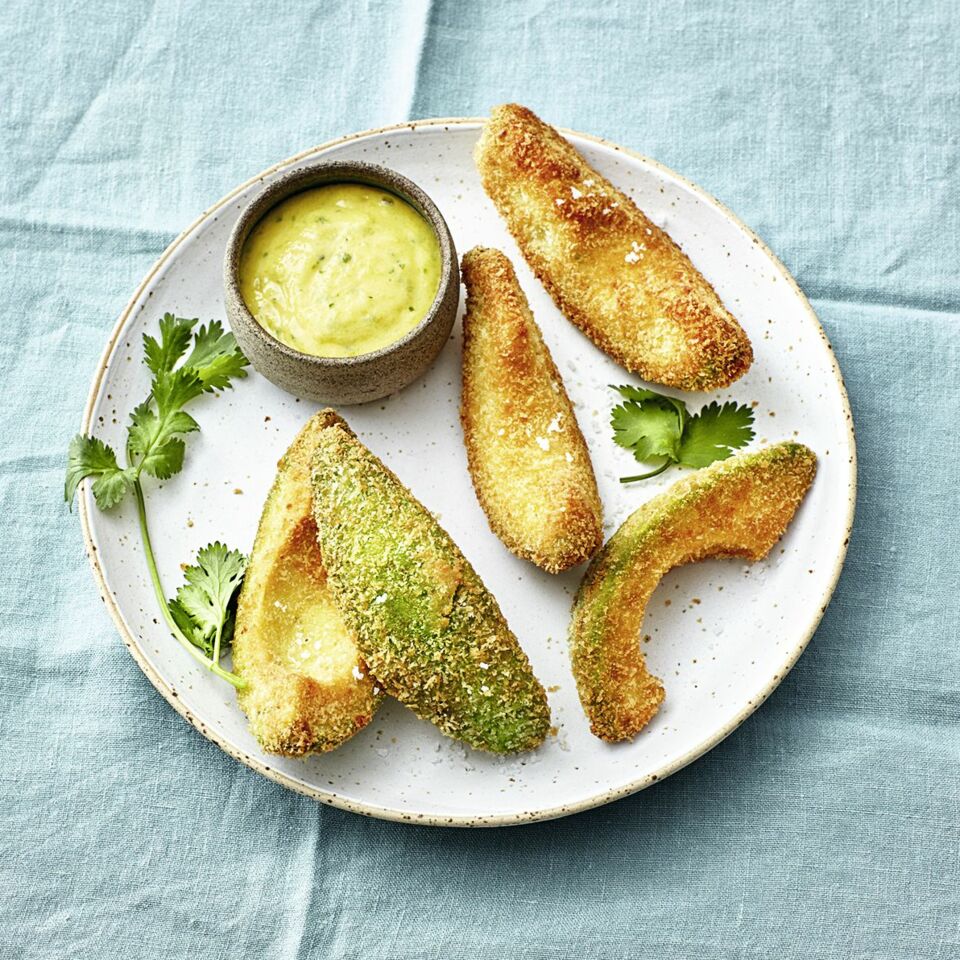 Den Backofen auf 80° vorheizen. Die Avocados in einer Pfanne im Öl portionsweise bei mittlerer Hitze von jeder Seite 30-60 Sek. ausbacken. Herausnehmen und auf Küchenpapier abtropfen lassen, im Ofen warm halten. Mit dem Mangodip servieren.