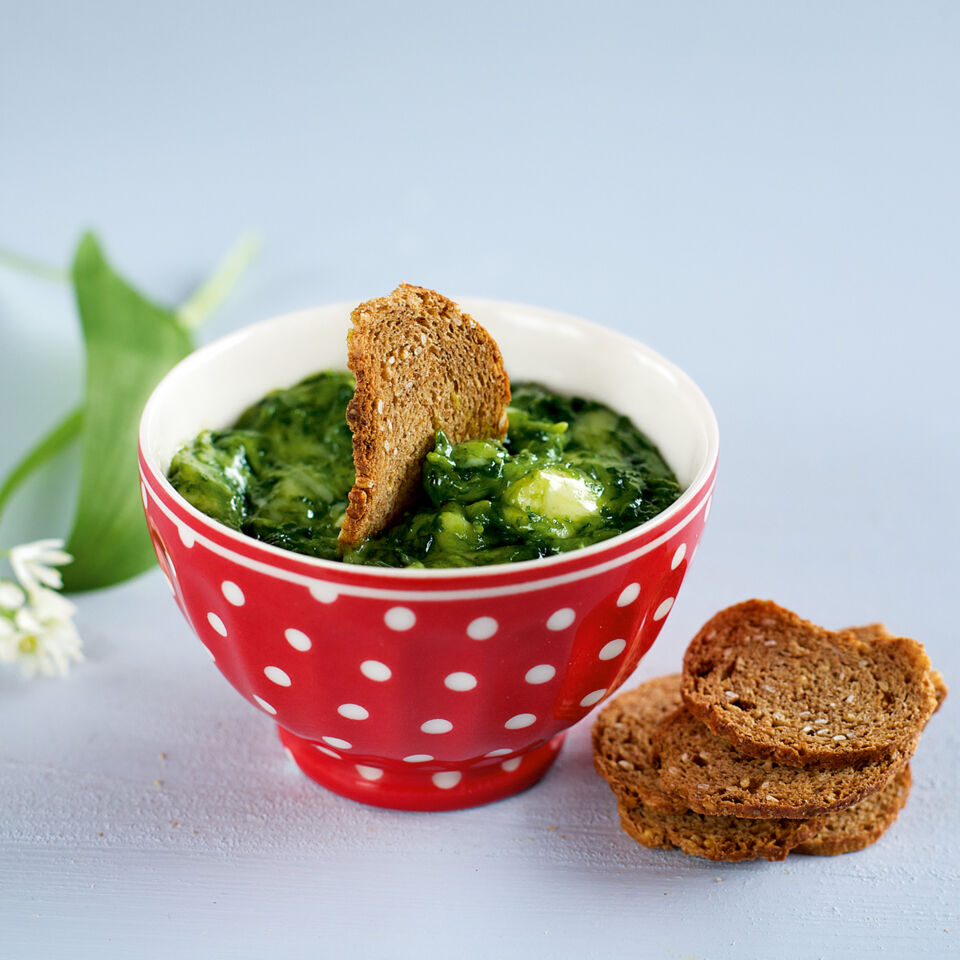Den Bärlauch waschen, trocken tupfen, die Stiele entfernen, die Blätter grob zerschneiden und mit der weichen Butter und dem Quark pürieren.