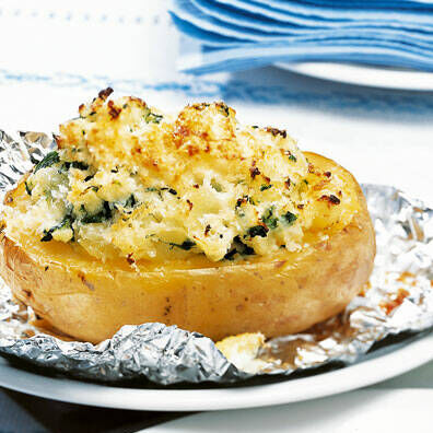 Eine cremige Füllung aus Ricotta und Bärlauch ziert die schlichten Ofenkartoffeln im Frühling.