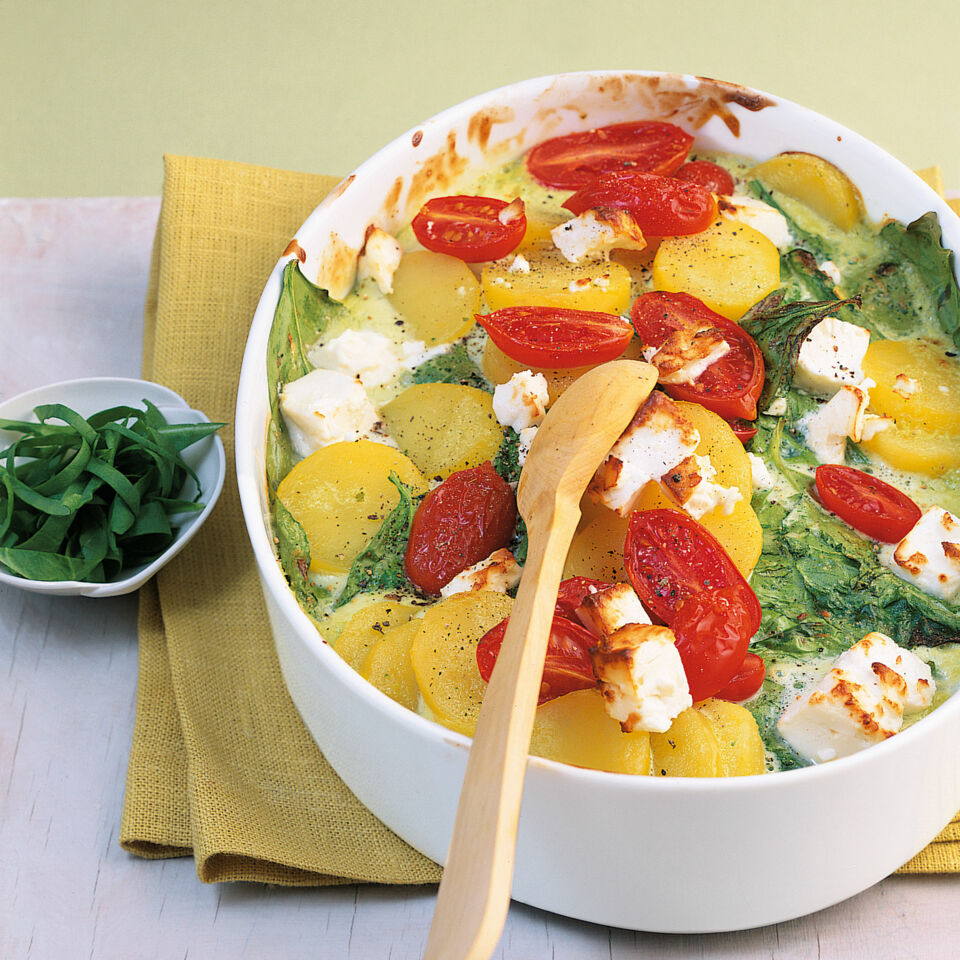 Den Backofen auf 200° vorheizen. Die Kartoffeln pellen und in Scheiben schneiden. Kartoffeln und Spinat mit der Sauce vermischen und in eine gefettete Auflaufform füllen. Mit Alufolie abdecken und in den Ofen (Mitte, Umluft 180°) geben. Nach 15 Min. aus dem Ofen nehmen. Tomaten und Feta darüber verteilen und offen weitere 10-15 Min. backen. Die restlichen Bärlauchblätter grob hacken und über den fertigen Auflauf streuen.