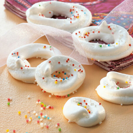 Damit die Baiserringe wirklich knusprig und nicht zäh wie Klebstoff werden, müssen sie im Ofen bei niedriger Temperatur lange trocknen. Geduld steht hier vor dem Genuss.