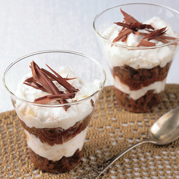 Die Hälfte der Biskuits zerpflücken, in zwei Gläser geben und mit je 2 EL Marsala beträufeln. Jeweils ein Viertel der Bananensahne daraufgeben und 1 TL Schokospäne darüberstreuen. Die restlichen Biskuits daraufbröseln, mit Marsala tränken und die restliche Creme darauf verteilen. Mit den übrigen Schokospänen bestreuen und bis zum Servieren kalt stellen.