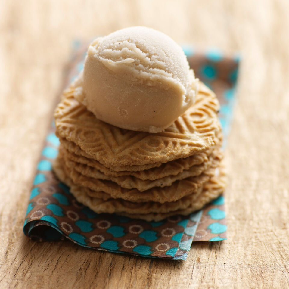 Die Bananenmasse in die Eismaschine füllen und cremig fest frieren lassen. Das fertige Eis aus der Maschine schaben und sofort servieren oder in einem Gefrierbehälter tiefkühlen.
