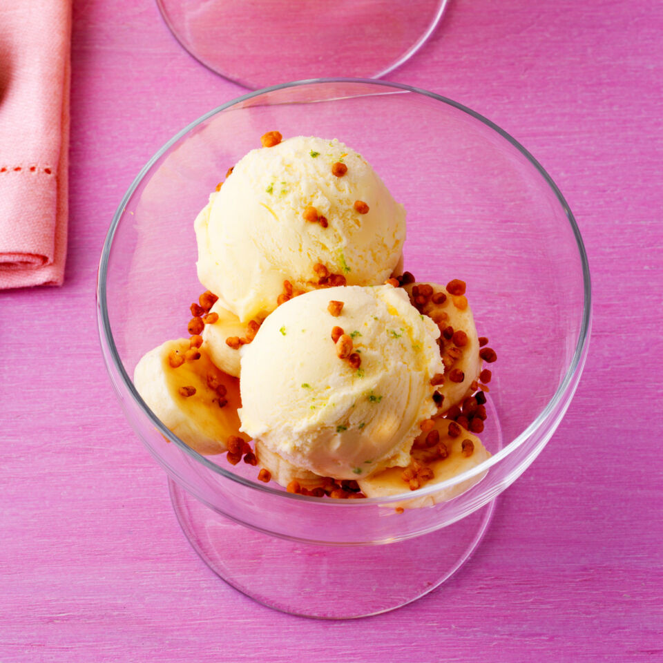 Dieses exotisch gewürzte Eis ist schnell vorbereitet. Allerdings muss man dann etwas Geduld mitbringen, bis die Frostfee das Bananen-Tofu-Püree in Eis verwandelt hat.