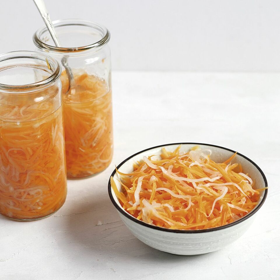 Rettich und Möhren auf drei Einmachgläser (à 400 ml) verteilen, bei Bedarf hineinpressen. Den Sud darübergießen. Die Gläser verschließen und das Gemüse mindestens 2 Std., besser über Nacht, im Kühlschrank ziehen lassen.