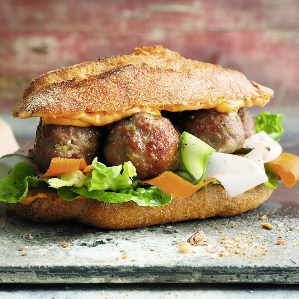 Den Backofengrill einschalten. Mayonnaise und Chilisauce verrühren. Die Brötchen aufschneiden, mit der Chili-Mayonnaise bestreichen und im Ofen (Mitte) in 3-4 Min. goldbraun überbacken. Untere Brötchenhälften mit Salat-Mix, Gurke, Möhren, Rettich und den Hackbällchen belegen. Obere Brötchenhälften daraufklappen, sofort servieren.