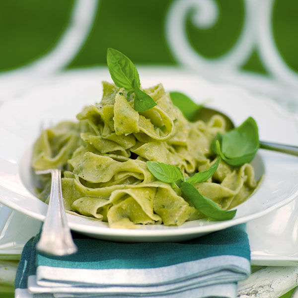 Das Mehl auf die Arbeitsfläche sieben, in die Mitte eine Mulde drücken. Die Eier aufschlagen, in die Mulde geben, das Basilikumpüree dazugeben und alles zu einem glatten, elastischen Teig verkneten. Den Teig in Klarsichtfolie wickeln und 1 Std. ruhen lassen.