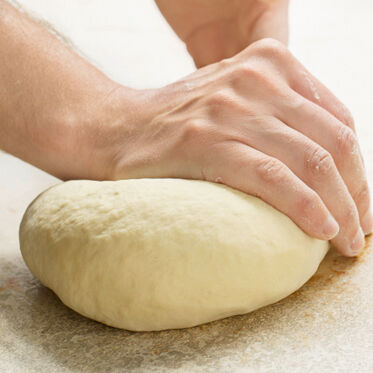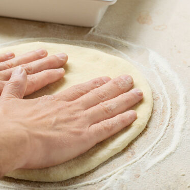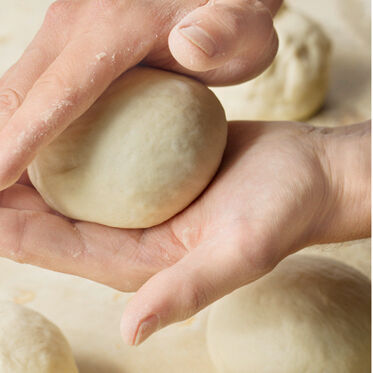 Pizzateig in 4 oder 6 gleich große Stücke teilen und zu Kugeln formen. Dafür den Teig mit gleichmäßigen, kreisenden Bewegungen zwischen den Handflächen »schleifen«, bis die Oberfläche der Teigkugel glatt ist.