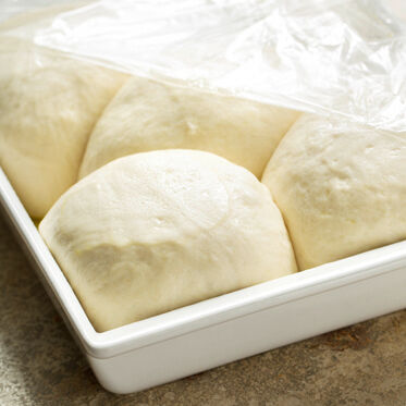 Eine große Auflaufform leicht ölen. Die Teigkugeln leicht ölen, hineinlegen und mit einem Deckel oder Frischhaltefolie zudecken. Den Teig an einem warmen Ort 45-60 Min. gehen lassen, bis er sein Volumen fast verdoppelt hat. Geht der Teig zu schnell auf, in den Kühlschrank stellen.