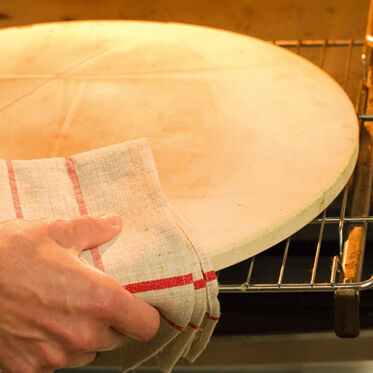 Eine Teigkugel auf einer mit Wiener Grießler, Spätzlemehl oder Pizzamehl bestäubten Arbeitsfläche zu einem Kreis von ca. 30 cm Ø (oder ca. 20 cm Ø bei 6 Pizzen) dünn ausrollen oder zuerst mit den Fingerkuppen flach drücken und dann ähnlich wie einen Strudelteig rund ausziehen – so wird der Rand schöner. Ein Backpapier auf ein Brett oder ein Blech ohne Rand legen, den Teig auf das Backpapier legen.