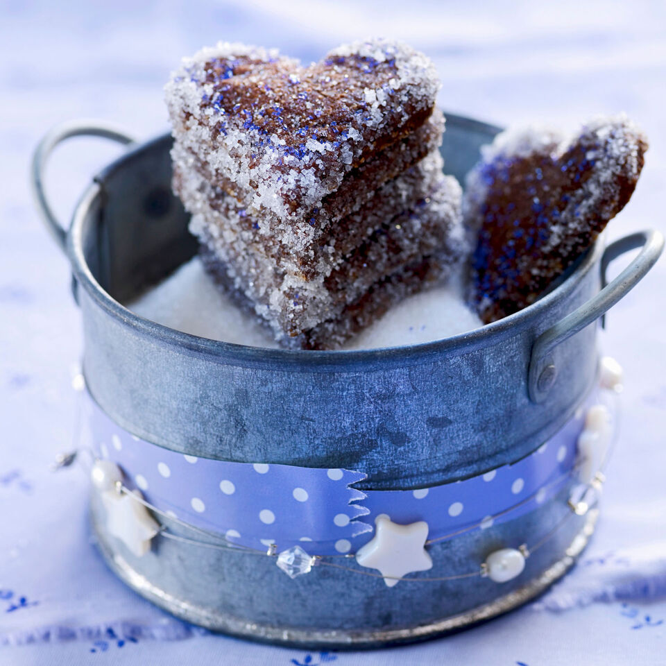 Zwei Backbleche mit Backpapier auslegen und mit Zucker bestreuen. Den Teig zwischen Klarsichtfolie oder auf einer gezuckerten Arbeitsfläche ca. 1 cm dick ausrollen. Aus dem Teig 45 Herzen ausstechen, diese auf die Bleche legen und offen ca. 12 Std. bei Zimmertemperatur trocknen lassen.