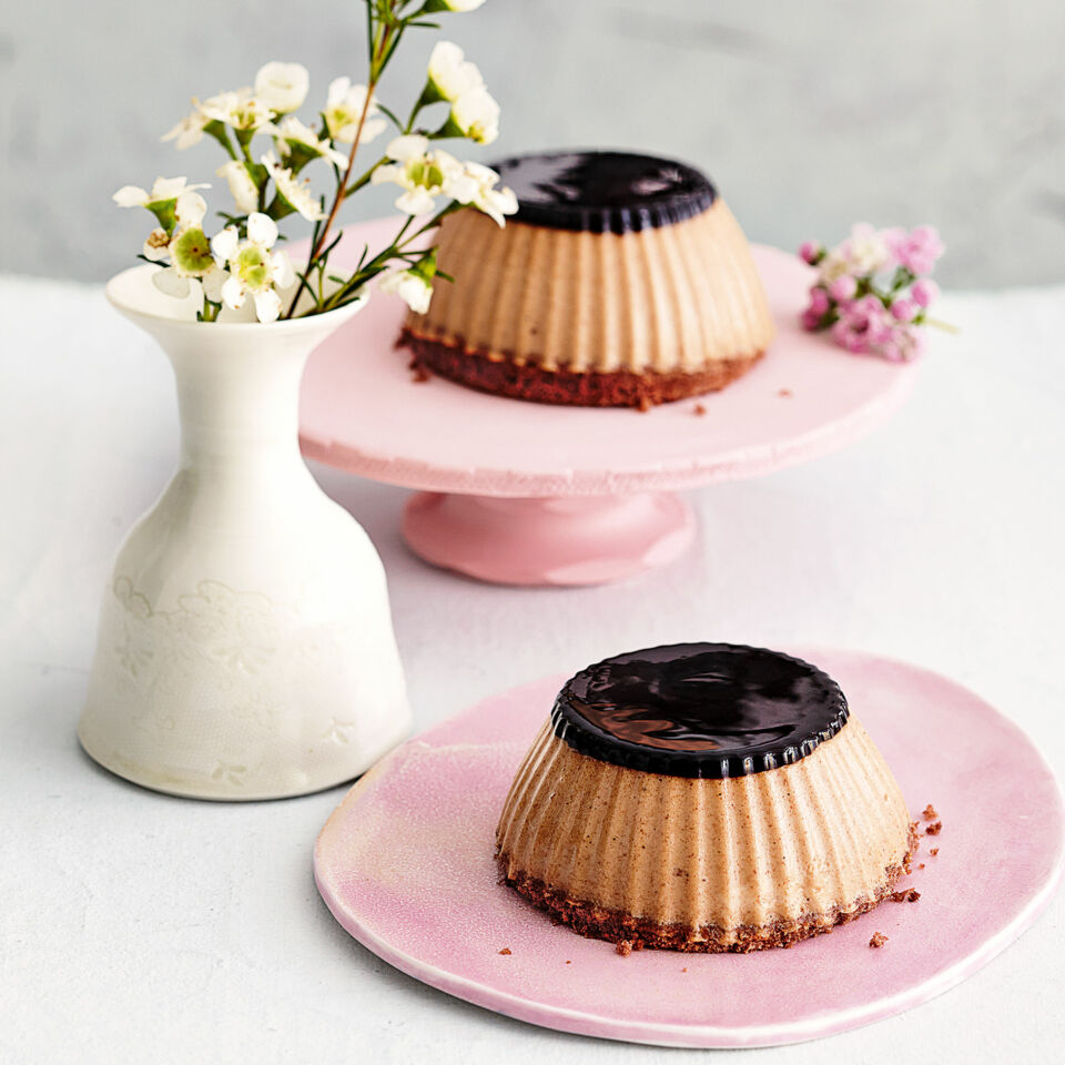Den Schokobiskuit nach dem Grundrezept (siehe Rezept-Tipp) zubereiten und ausstechen. Für den Schokospiegel die Gelatine in kaltem Wasser ca. 5 Min. einweichen. 60 g Sahne mit 70 ml Wasser und Zucker aufkochen. Das Kakaopulver unterrühren und die Mischung auf ca. 60° abkühlen lassen. Die Gelatine ausdrücken und in der heißen Schokosahne auflösen. Die Schokosahne gleichmäßig auf die Förmchen verteilen. Die Förmchen ca. 1 Std. ins Tiefkühlfach stellen, bis der Spiegel fest ist.