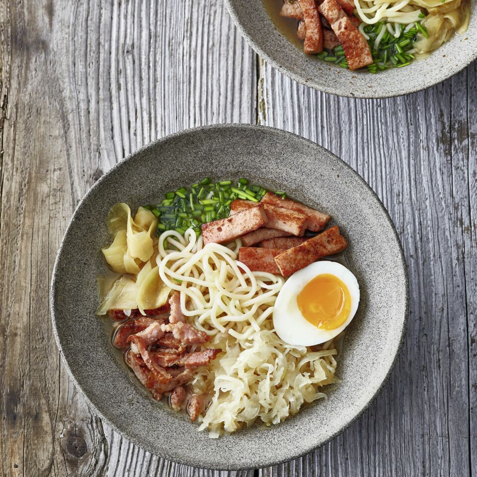 Bayerischer Wiesn-Snack trifft auf japanische Nudelsuppe. Kann das gut gehen? Aber sowas von! Mit Leberkäse und Sauerkraut ein echter Genuss.