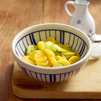 Die Gurke waschen, streifig schälen und längs vierteln. Die Viertel in dünne Scheiben schneiden, zu den Kartoffeln geben. Die Petersilie waschen, trockenschütteln und fein hacken. Ebenfalls zu den Kartoffeln geben, alles gut mischen und abkühlen lassen. Den Kartoffelsalat mit Salz und Pfeffer abschmecken, den Salat zugedeckt im Kühlschrank aufheben.