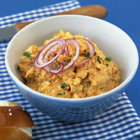 Den Brotzeit-Klassiker serviert man zu frischen Brezeln und Rettich oder Radieschen. Keine Kinder am Tisch? Dann darf auch ein Schuss Bier in den würzigen Aufstrich.