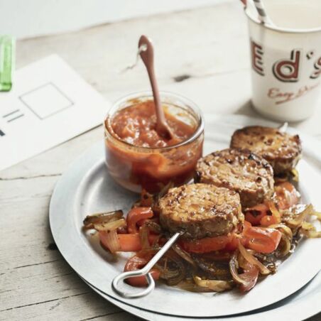 Die Pfanne säubern, dann 1 EL Öl darin erhitzen. Zwiebel- und Paprikastreifen darin unter Rühren in ca. 5 Min. bissfest garen, dann mit der Tempeh-Marinade ablöschen. Das Gemüse salzen und pfeffern und mit den Tempeh-Spießen und der BBQ-Sauce anrichten.