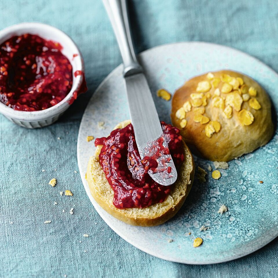 Die Konfitüre passt aufs Chia-Lupinen-Brot, auf die Lupinen-Brötchen oder auf jedes andere Brötchen.