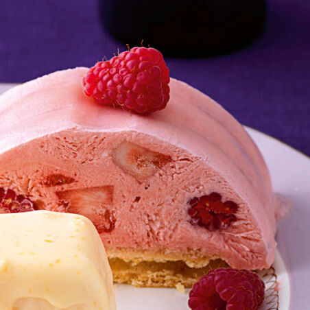 Die Beerencreme in die gekühlte Form geben und 15 Min. ins Tiefkühlfach stellen. Die Gebäckröllchen als Boden darauflegen. Die Masse mindestens 12 Std. ins Tiefkühlfach stellen. Zum Servieren das Parfait auf eine Platte stürzen und die Folie entfernen. Mit Himbeeren verzieren.