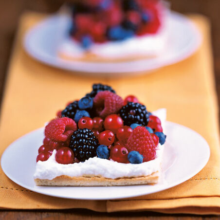 Ein unwiderstehlicher Sommerhit! Der Clou: ein knuspriger Mandelboden mit einer cremigen Joghurt-Sahne-Schicht und sommerfrischen Beeren obendrauf.