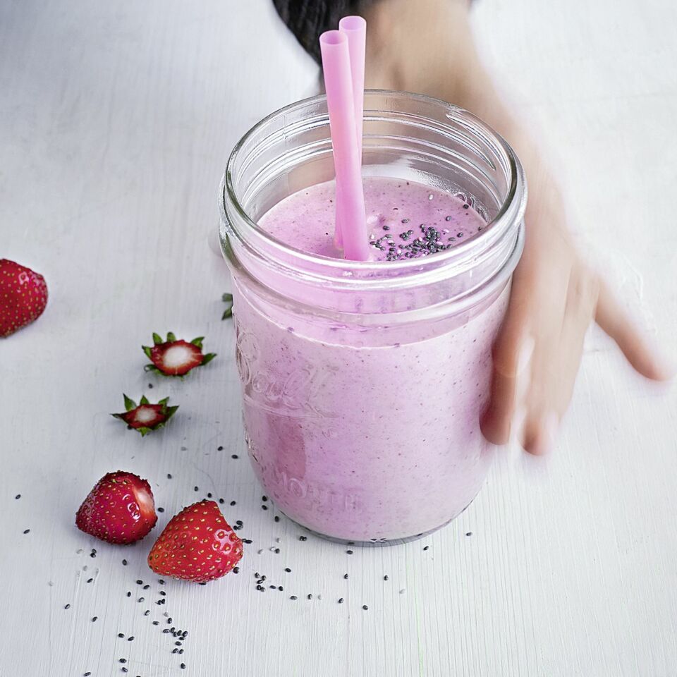 Erdbeeren waschen, das Grün entfernen, die Beeren halbieren. Zusammen mit den Hafer- und Kokosflocken sowie 150 ml Wasser und der restlichen Kokosmilch in den Mixer geben und zu einem cremigen Shake mixen.