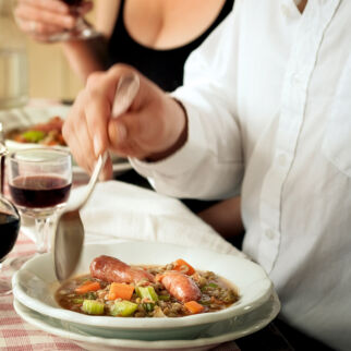 Die Linsen hinzufügen und alles mischen. Den Rotwein dazugießen und aufkochen. Die Kräuter waschen, trocken schütteln und mit Lorbeer und Gemüsebrühe in den Topf geben. Alles bei mittlerer Hitze 35 Min. mit schräg aufgelegtem Deckel köcheln lassen, dann mit Pfeffer und, falls nötig, mit Salz abschmecken. Lorbeerblatt und Kräuter nach Belieben vor dem Servieren entfernen.