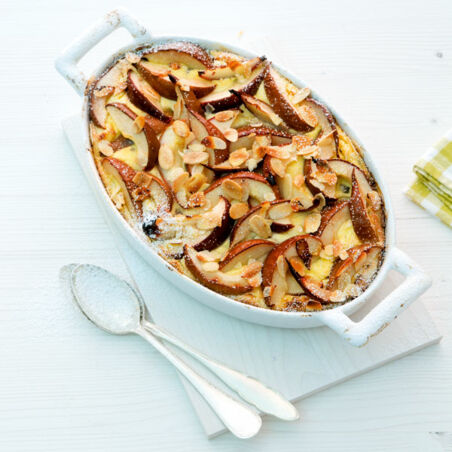 Den Auflauf im heißen Backofen (2. Schiene von unten, Umluft 180°) in ca. 30 Min. goldbraun backen. Nach Belieben vor dem Servieren mit Puderzucker bestreuen.
