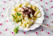 Die Schokoquarkcreme auf das Birnenkompott geben. Das Dessert mit Zitronenmelisse garnieren und genießen.
