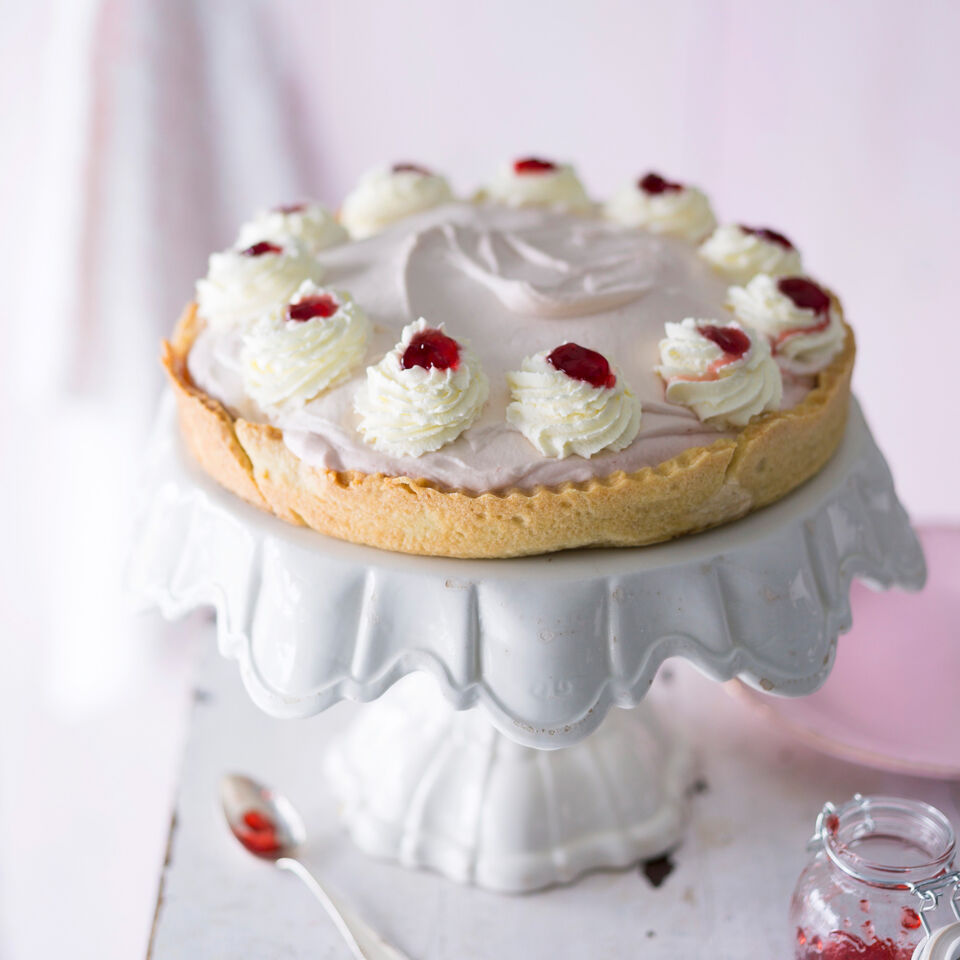 Die getränkten Birnen auf den gebackenen Mürbeteigboden legen und die Quarkmasse kuppelartig darüberstreichen. Die Johannisbeersahne über der Kuppel verstreichen. Restliche Sahne mit einem Spritzbeutel mit Sterntülle als Tupfen auf der Kuppel verteilen. Sahnetupfen mit dem übrigen Gelee garnieren. Torte vor dem Anschneiden ca. 8 Std., am besten über Nacht, kühl stellen.