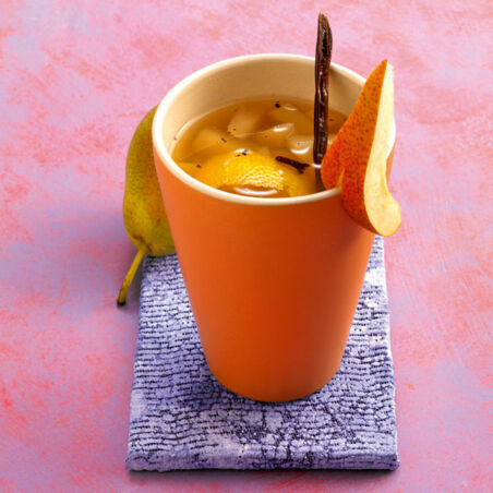 Die Birnenstückchen und den Birnengeist unterrühren und nochmals 3 Min. ziehen lassen. Den Punsch gleichmäßig auf hitzebeständige Gläser oder Becher verteilen. Das übrige Birnenviertel in Spalten schneiden und an den Glasrand stecken.