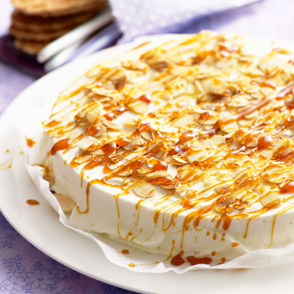 Die Tarte aus der Form heben. Die Folie abziehen und den Eiskuchen auf eine Platte setzen. Mit den gerösteten Mandeln bestreuen und den Karamell mit einer Gabel in Fäden darüberträufeln. Die Birnentarte etwa 25 Min. antauen lassen, dann mit einem langen Messer in Stücke schneiden und zum Kaffee servieren.