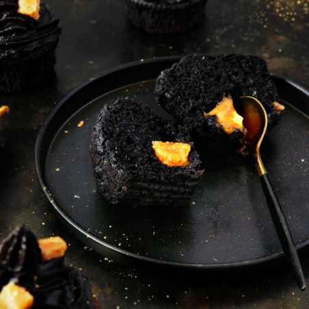 Diese Cupcakes mit schwarzem Kakao sind ein Hingucker auf jeder Party. Mit einem Karamell Bonbon im Inneren überraschen sie auch geschmacklich auf voller Linie.