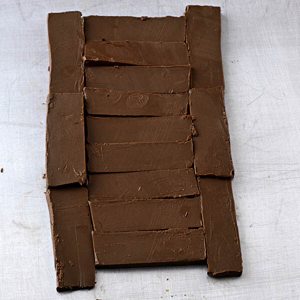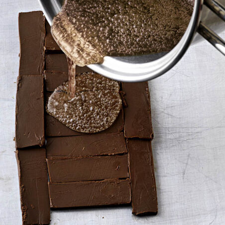Die kochende Zuckermasse vorsichtig auf den Nugat schütten und die heiße Masse sofort mit dem Spachtel falten und einschlagen. Diesen Vorgang so oft und so schnell wie möglich wiederholen. Je öfter die Masse touriert wird - so heißt das Falten in der Fachsprache -, desto feinblättriger wird der Krokant. Fortfahren, bis die Masse abgekühlt ist und sich nicht mehr tourieren lässt. Masse in ca. 30 Stücke schneiden und in ca. 30 Min. vollkommen auskühlen lassen.