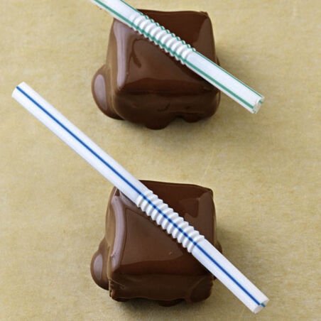 Krokantstücke nacheinander mit der Pralinengabel in die temperierte Kuvertüre tauchen, bis sie komplett damit überzogen sind. Stücke auf Butterbrotpapier ablegen und sofort auf jedes Stück ein Stück Trinkhalm drücken. Wenn die Kuvertüre völlig ausgehärtet ist, die Trinkhalme abziehen.