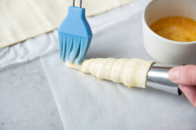 Blätterteigrollen mit dem Ei bestreichen. Anschließend im Backofen ca. 20 Minuten goldbraun backen. Fertige Rollen aus dem Ofen nehmen, etwas auskühlen lassen und aus den Formen lösen.