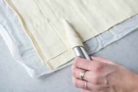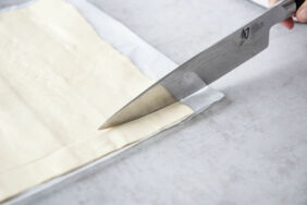 Backofen auf 200 Grad Umluft vorheizen. In der Zwischenzeit Blätterteig ausrollen und der Länge nach in ca. 3 cm breite Streifen schneiden.