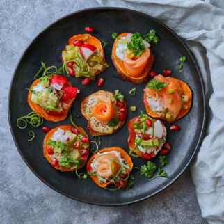 Für die Creme Dill abbrausen, trocken schütteln und zusammen mit Räucherlachs, Frischkäse, Mandelmilch und Limettensaft in einer Schale zu einer feinen Creme pürieren. Mit Pfeffer abschmecken.
