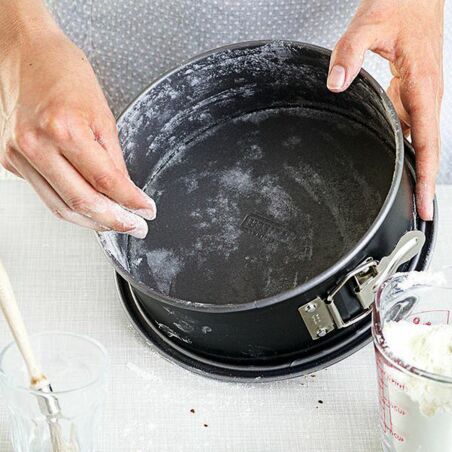 Den Backofen auf 180° vorheizen. Boden und Rand der Springform mit etwas Öl einfetten. Die Form mit Mehl, Semmelbröseln oder Nüssen ausstreuen.