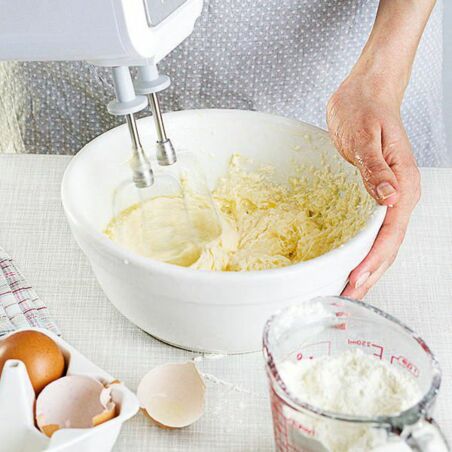 Butter, Zucker und evtl. Vanille mit den Quirlen des Handrührgeräts auf höchster Stufe cremig rühren. Eier einzeln einrühren, bis eine glatte Masse entstanden ist.