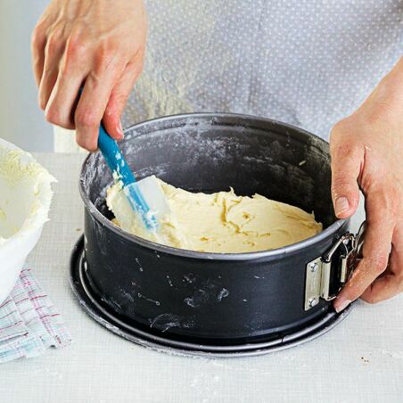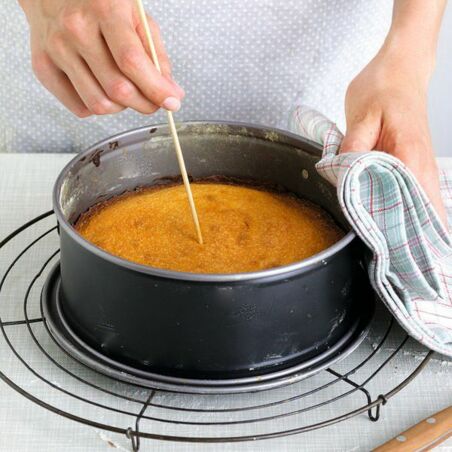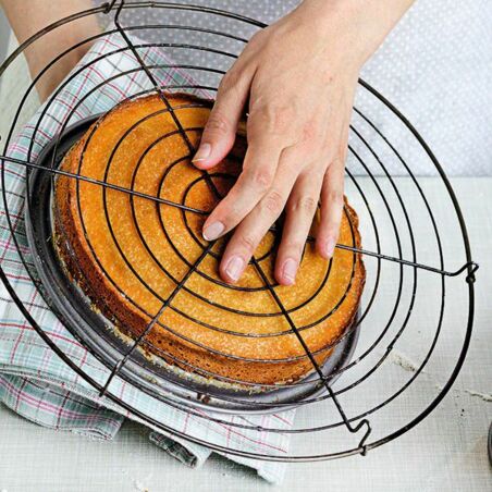 Den Kuchen 5 Min. ruhen lassen. Den Formrand mit einem Kuchenlöser oder Messer lösen und abnehmen. Den Kuchen stürzen und den Formboden abheben.