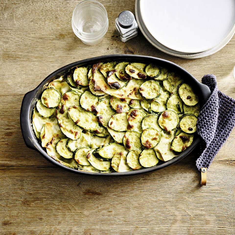 Eine Auflaufform (20 cm × 30 cm) gut einfetten. Abwechselnd Lasagneplatten und Zucchini-Sauce einschichten. Mit Zucchini beginnen und abschließen. Im Ofen (Mitte) in 40 Min. leicht braun backen.