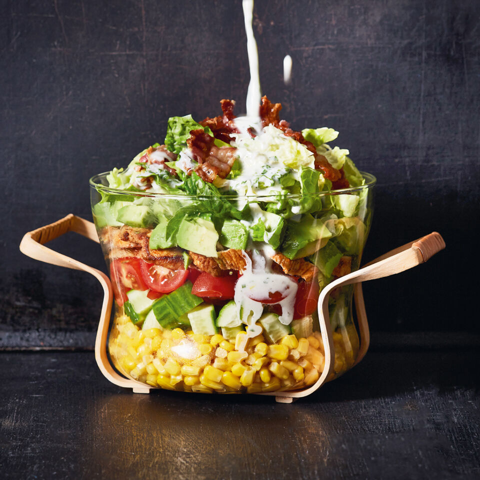 Mais, Gurke, Tomaten, Hähnchenfleisch, Avocado und Römersalat in dieser Reihenfolge übereinander-schichten. Das Dressing darübergießen und den Frühstücksspeck daraufgeben.