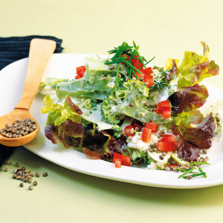 Frühlingsfrisch erfreut dieser Salat das Genießerherz. Die gerösteten Hanfsamen crunchen mit Brokkoli- und Blumenkohlröschen um die Wette.