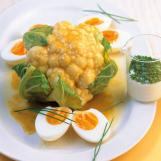 Anrichten: Dressing auf Teller verteilen, Püree in die Mitte setzen und Kohlröschen daraufgeben, den Eier-Mix darüberstreuen. Trüffel in Spänen darüberhobeln.