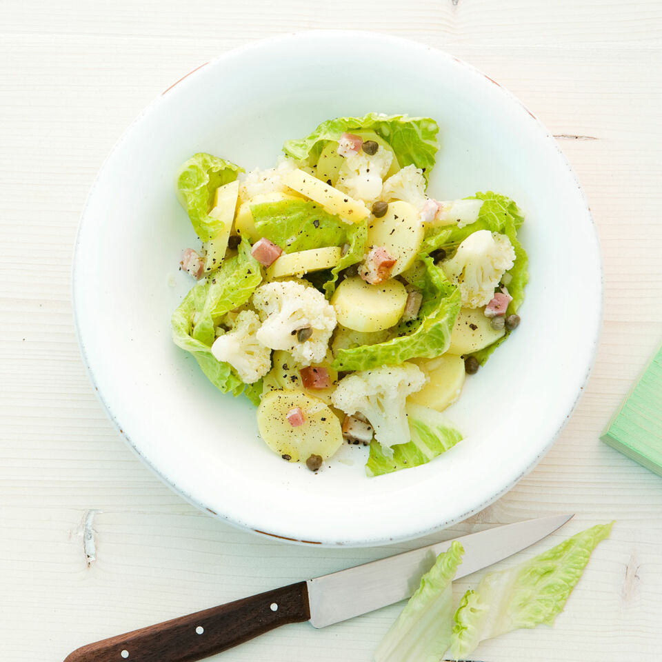 Mit frischem Grün (Romanasalat) eine tolle Knollenversion. Für würzigen Pep sorgen Kapern und Schinkenstückchen.